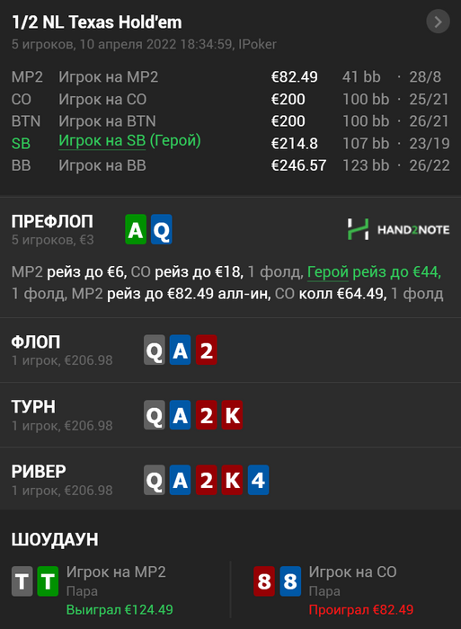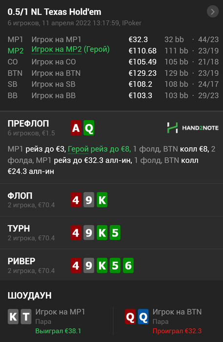 ну вот это я понимаю уже, по канонам катаешь, братишка, ставлю класс!!! можно было еще третью вхуярить, чтоб выбить руки лучше, которые он чекбекнет ривер.