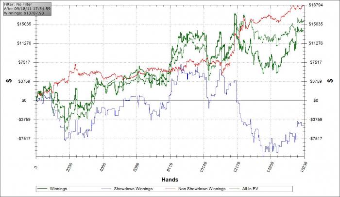 Когда же оппонент отгружает тебе овербеты один за другим, ты просто обязан начинать тонко вэльюрейзить и превращать какие-то руки в блеф (т.к. в поте море бабла, а на AQ каких-нибудь ему коллить нельзя). Здесь текстура доски идеально подходит под оппа пункта, потому что существенную часть моего рейнджа составляют руки типа Ax, что будет склонять его к их выбиванию/лучшему извлечению вэлью посредством овербета.