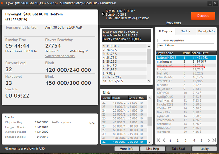 Всем удачи на покерных турнирах, будьте сильными и не прогибайтесь под обстоятельства.
