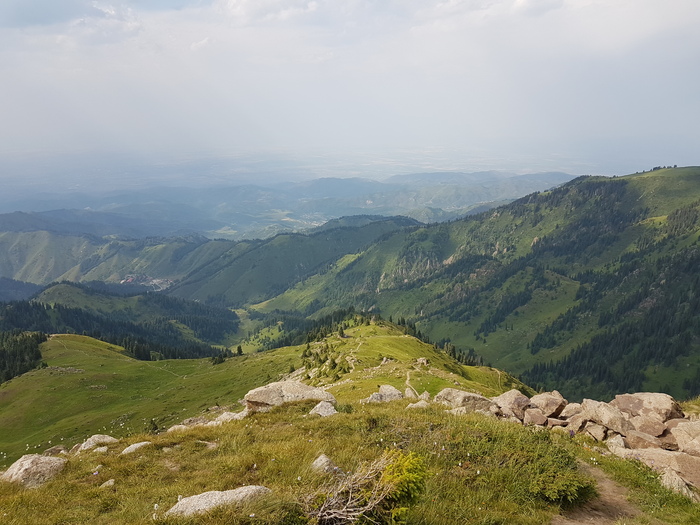 Ну и кроме чая, воды я не брал, в итоге поднимался на диком сушняке - экономил для чаепития наверху, и останавливался остыть под каждой тенью. Фотография с подъёма будет только одна, т.к. отсюда их было предостаточно. Левый пупырь - Фурмановка, трапеция правее - Панорамная. Если зазумить, можно увидеть внизу вкусных коняшек (кто был в Казахстане и не ел казы - тот дурак :P), там я буду спускаться обратно: