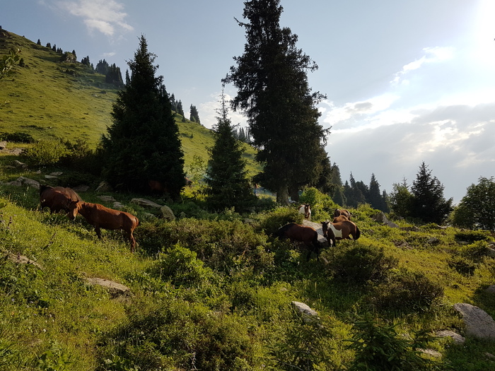 Те самые казы коняшки, тут туристы с собакой воткнули палатки в ёлках, чем сильно заинтересовали лошадей, пока я проходил, собака заливалась в истерике, а народ тщетно пытался отгонять любопытствующих скакунов от лагеря