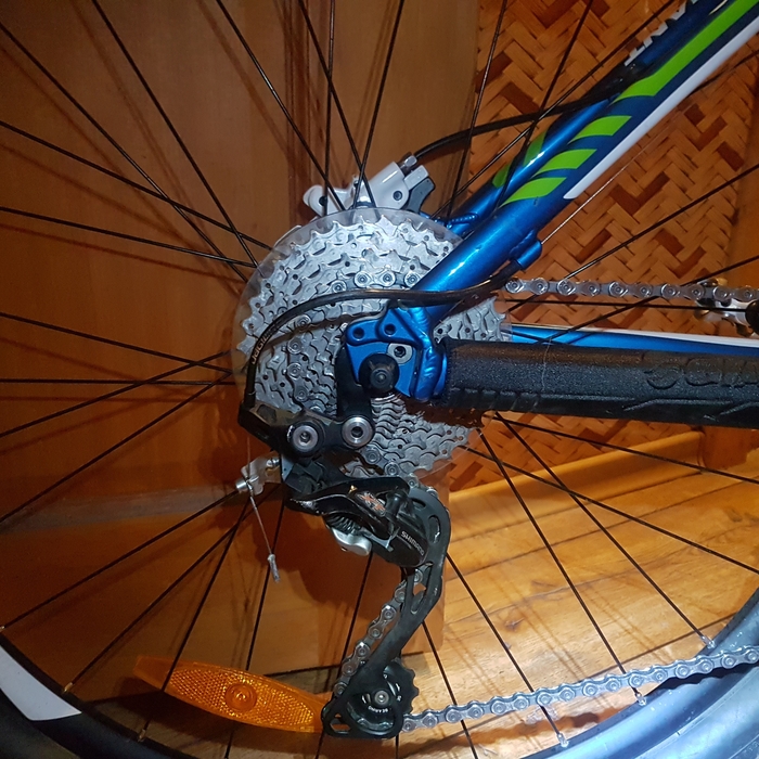 Ну и перед этим решил нормально почистить трансмиссию, а то кассета была адски чёрной, с налипшей масло-пылью (до этого пытался, но получалось так себе). Как средство выбрал ультимативную штуку, которую открыл для себя недавно - то, чем чищу запущенную кухонную плиту и вытяжку. Всё прошло отлично, забрызгал/смысл пару раз, потом прошёлся ещё и цепе-кассетным очистителем, вернул практически изначальный вид (жаль ДО не щёлкнул):