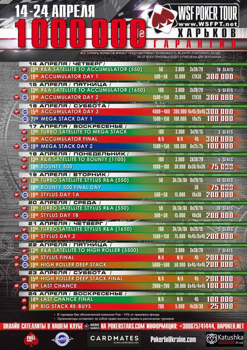 В прошлом расписании действительно можно было два дня курить бамбук(уехать в Киев) вылетев из баунти в первый день. Ведь ехать в другой город чтобы три дня играть в турнире за 500 грн(а тем более сателлиты к ним за 50грн) просто нерентабельно, т.к. проживание + питание обходится дороже бай-ина. Вывод - сделайте больше однодневных турниров, со средними БИ, - это лучше чем дешевые трехдневные турниры с низким БИ.