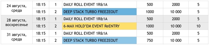 16:15 - DAILY ROLL EVENT 1R&1A, 500 руб. 16:15 - DEEP STACK Freezeout, 1000 руб.