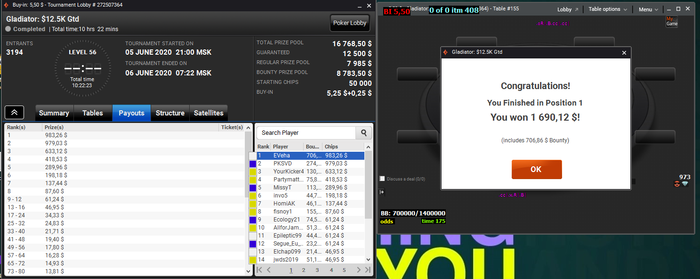 Но в любом случае спасибо за совет на какое то время конечно добавлю более спокойных турниров, но страсть к килополям у меня уже не искоренить, дважды за год пофиналить сандей шторм (пусть и обломаться в обоих) тот еще адреналин.