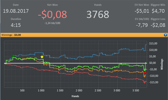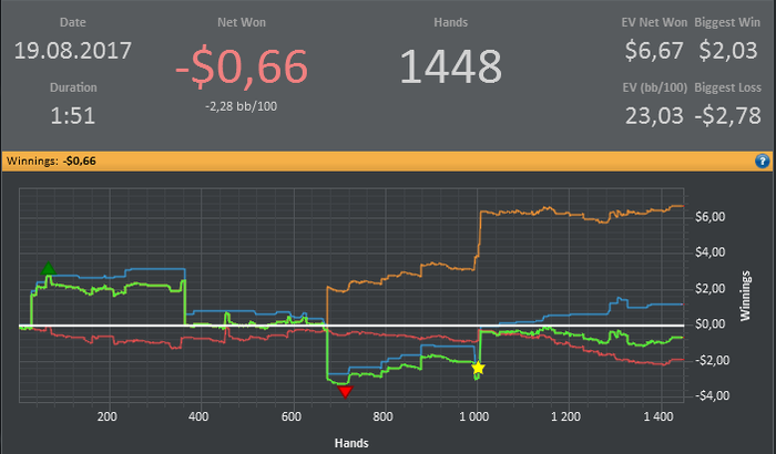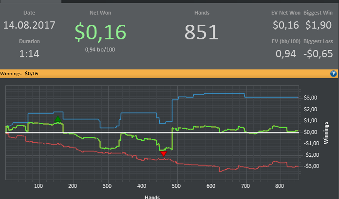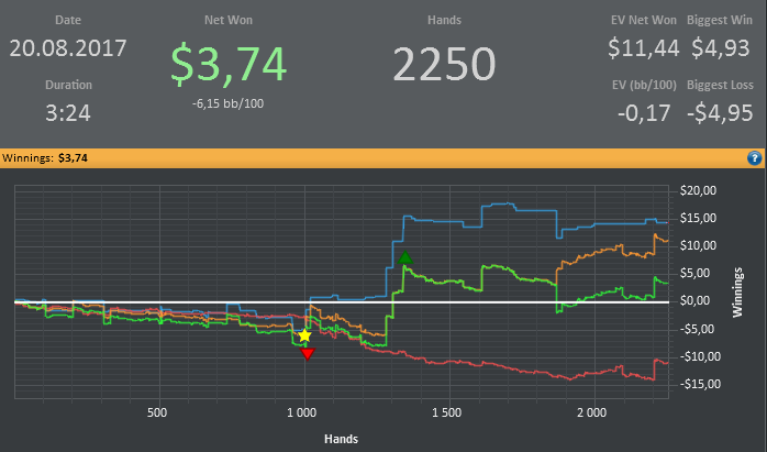 второй заход, ну сыграл 500 рук, апнуло, съебни, вот захер такие синусоиды рисовать, тысяча рук на пятерках, пошел на десятки отбиваться, думаю БИ если залью, кэшаут и ебал я в рот ваш покер