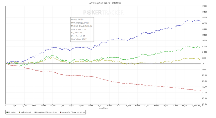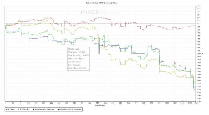 Причем совершенно точно, что если бы этот стрик на меня не влиял психологически, то картина была бы намного приятней. Нет сомнений, что хороший игрок проиграл бы на 2/3 меньше, а то еще бы и в плюс сыграл.