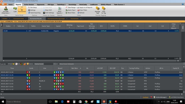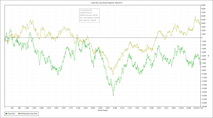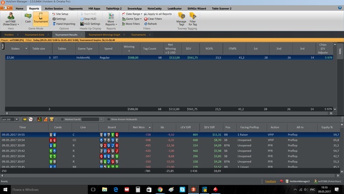 А по мне, так наоборот по выходным просто безумно приятно играть. Безумцы, конечно, за каждым столом практически, но если б не они, где бы мы брали EV. Эти выходные у меня так вообще рекорды все побили - 272 турнира со 126 EV-фишками --- Кстати, если кто из Вас пользуется PT4, не подскажете, как вывести Chip EV|tourney в инфо-бокс? Неужели его нет в чистом трекере, и его нужно закидывать отдельно? А то считать вручную немного надоело на самом деле..