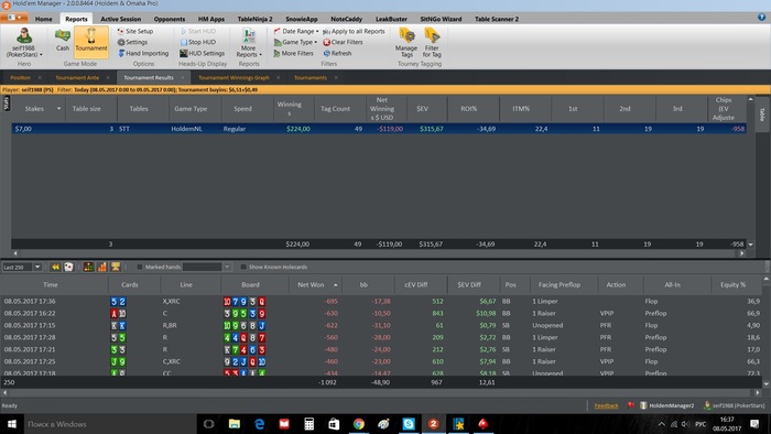 Neonlight @ 7.5.2017 seif1988, странно. Я сам работаю с ними, но мне они считают иначе. При таком подходе ведь не учитываются отдельные турниры с их множителями, а берется среднее значение. Я с ними рассчитываюсь иначе: Отправляю им в конце шага расчета ХэндХистори (запрашиваю у старзов) и аудит счета, они обрабатывают эти данные и выдают итоговый результат. ХХ загружается в PT4, а по аудиту смотрят реальное изменение баланса. ПТ4 рассчитывает каждый турнир в отдельности по EV$ и суммирует данные - прикреплю скриншот с примером для наглядности.