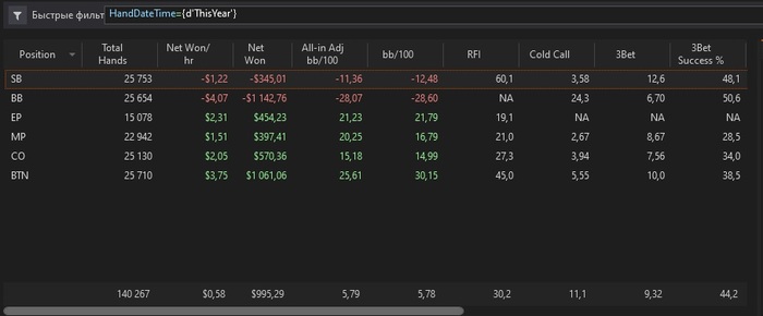 Посмотрел на днях свои статы по позам с начала года. Отыграно, конечно маловато, но для некоторых выводов рук хватает.