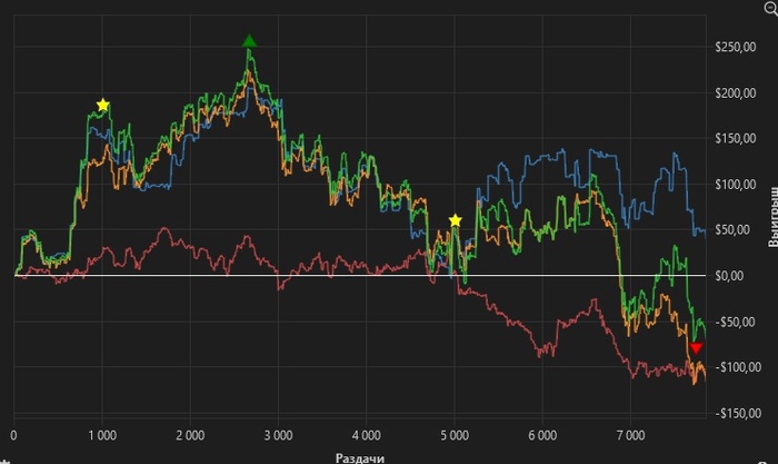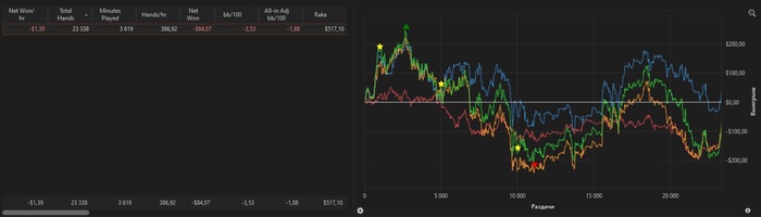 Одним словом, на данный момент имею 15БИ NL5 и там же буду играть рег столы. Играть буду до $120 и возвращаться на NL10 со стоплоссом $100. В случае, если и на этом лимите я окажусь ничтожеством, то проиграв 10БИ, привет NL2.