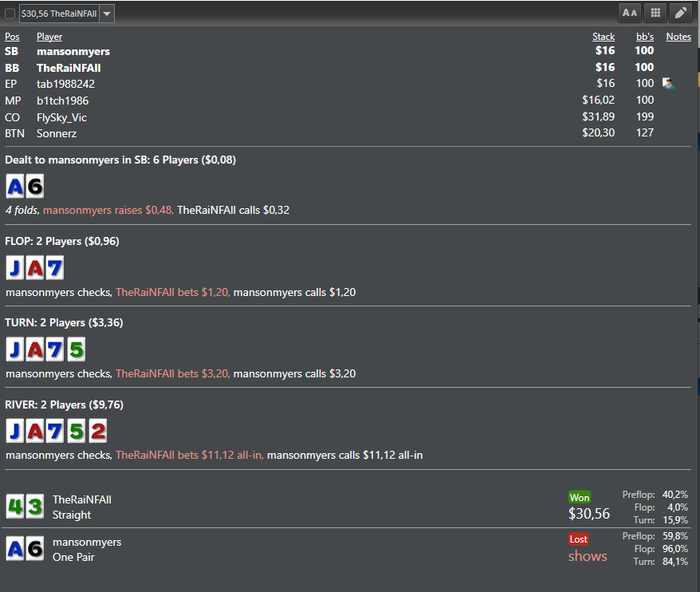Hudson, тут по идее АК или А6 не влияет что колить, т.к. мы только блефы бьем, я разбирал эту раздачу тут А10 точно не колится ривер например, т.к. блочит много блефов ему. Ну а так думаю все же у нас есть допперы для кола, а Ах обычные лучше фолд. Опп показал такое: