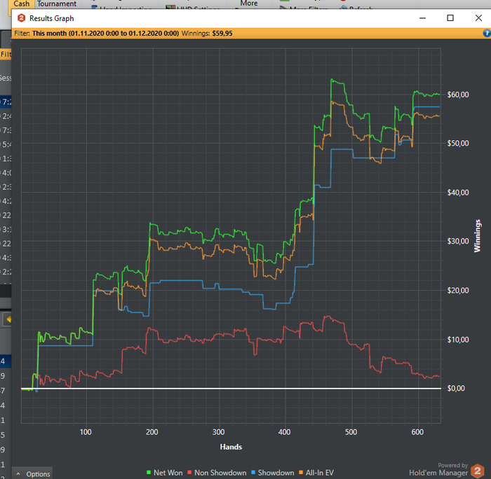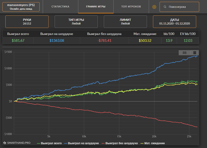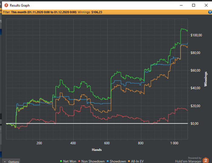 Ноябрь выдался неплохим по винрейту, но опять плохим по часам( Отыграл получается 96 часов, на теорию ушло примерно часов 12-13 (чисто разборы раздач). Хочется конечно на 25ку, но нужен нормальный банкролл, минимум 100би рабочего лимита (нл16) + 5-8би на шот 25ки и подушка на месяц, если что-то пойдет не так)(~200$) В общем где-то думаю ~2k должно хватить для шота, я думаю если играть хотя бы по 120 часов, то на это должно уйти месяца 2 игры. В общем, думаю нужно постараться поднажать в декабре, для большей мотивации даже договорились с другом) Всем гл) Также, купил наконец-то кресло, т.к. спина уже разваливалась играть на обычной табуретке, рабочее место теперь выглядит так)