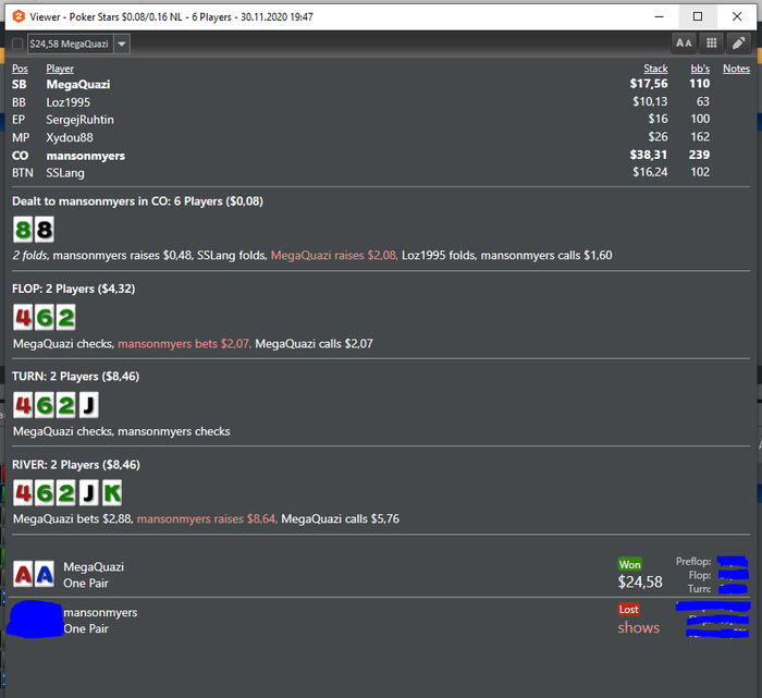 coldglock17 @ 12.11.2020 Сегодня сыграл интересную раздачу, опп достатчно блефовый, особенно ривер (агра 39), колили бы его? + кол, - фолд