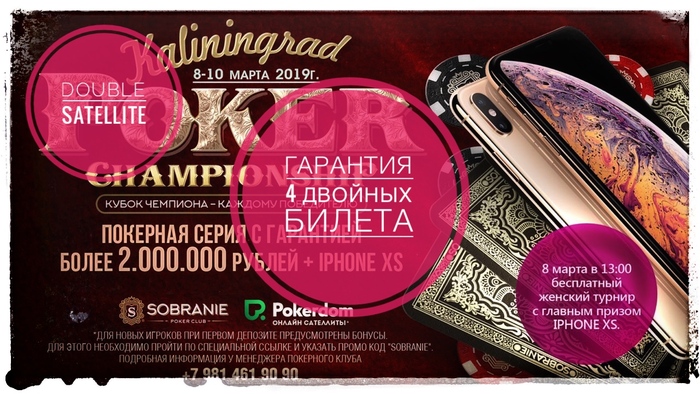 Ну а сегодня в среду в 21:15 состоится «Double Satellite» на покерную серию "Kaliningrad Poker Championship". Гарантия 4 двойных билета. Двойной билет - это билет на турнир First Event (8 марта в 17:00) + билет на турнир Main Event (9 марта в 15:00). Ждём всех желающих!