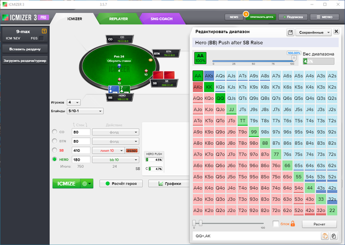 СБ лимп 100% мы же можем пушить 15.2%, при колле от оппонента в 27.6%!!! ICMIZER в данном случаи предлагает чекнуть королей. ХРК расчёт. Диап колла СБ ICMIZER Диап пуша ББ против такого колла