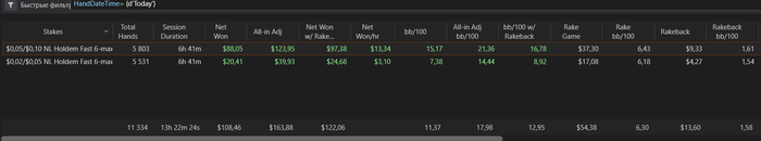 Сессия была разной: то кураж и всё как по маслу, то потеря нити игры. Чувствовал и уверенность, и сомнения — понимал оппонентов, но иногда что-то "щёлкало" и уверенность таяла. Были взлёты и падения: одни раздачи радовали, другие заставляли задуматься. Есть над чем работать — где-то не хватило выдержки, где-то чутья. Но это часть пути. Завтра новый день и новые возможности стать лучше.