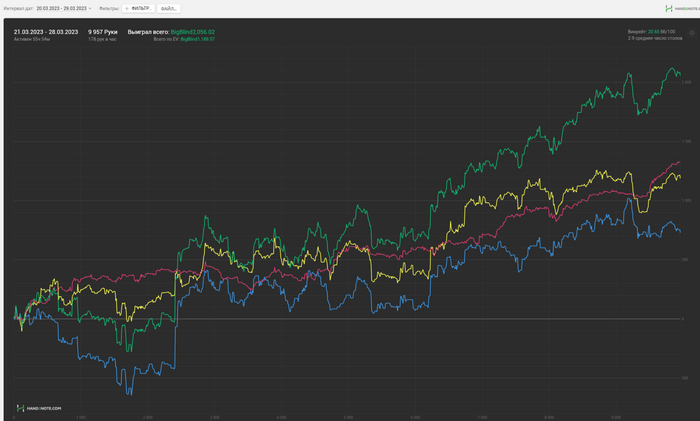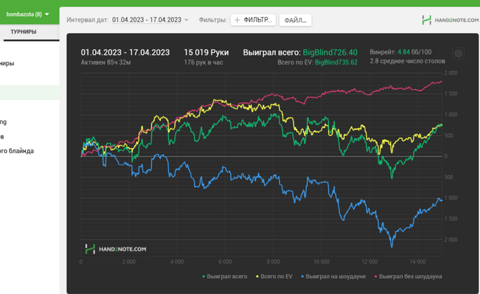 Если шо, я понимаю насколько я "далеко не самый сильный" игрок своего лимита, мне складывалось хорошо. Но зато в отличии от прошлого года, меня очень радует - что я действительно вижу куда расти. А еще очень мотивирует, что уже несколько человек в фонде в котором я состою в этом году выйграли уже более миллиона долларов, это конечно очень круто и сильно.