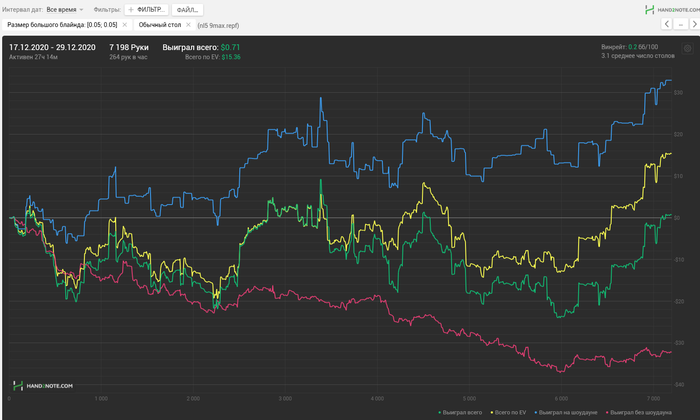 После НГ появилась мысля катать дальше, авось и нл5-10 так не за горами окажется. Ну и что, катал дальше несколько дней и решил попробовать шот нл5 с 10БИ (агробрм наше все ) со стоплом в 2-3БИ. Вышло удачно, поле отличалось, конечно, но не так чтобы сильно. В итоге дальше продолжил катать исключительно столы нл5 (6макс, 9 макс, не сразу определился с тем, что хочу катать, но в итоге остановился на 6макс).