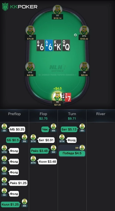 6. Тут или играл бы 50-75% флоп, овербет терн, чек ривер или чек-бек флоп, овербет терн, 50-75% ривер.