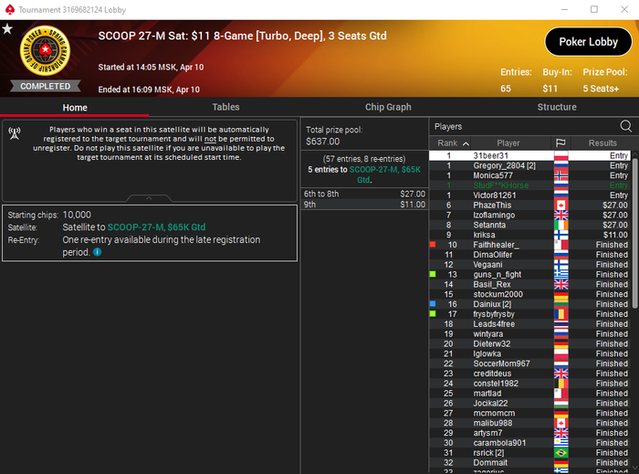 Спасибо PS было очень интересно! Для меня это новый опыт - Прое... турнир не выиграв ни одной раздачи!!! Очень понравилось!