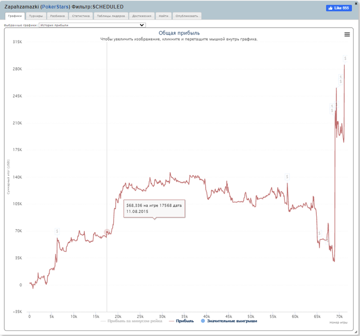Напрягает другое, вот его график... и 50К турниров в минус... Для меня 50К турниров - это от 15 до 20 лет, может ну его на хрен)))