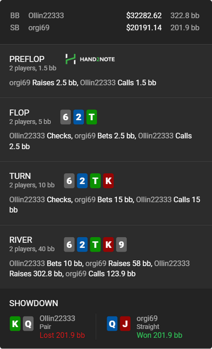 В этой кмк уместно было бы еще отметить что терн тоже сплитится на мелкую и овб, поскольку есть достаточно много рук типа двух пар, немного сетов 4 и 7, а также часть стритов, которые хотят добирать с неготовых рук и играя только за мелкую будут терять достаточно много велью, туда же можно засунуть руки типа оесд в качестве полублефа и нижние гш с 5 и 6 в качестве блефа имеющего блокер на стриты.