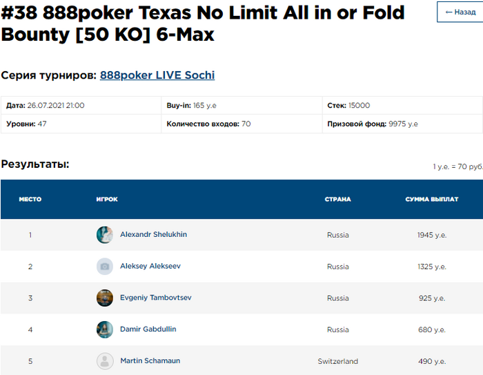 Александр Шелухин к сегодняшнему выступлению на финалке Мэйна (6-е место) приплюсовал победу в турнире All In or Fold. Она принесла ему 2395 у.е с учётом девяти баунти. А занявший второе место Алексей Алексеев умудрился наколотить 18 баунти (правда, пришлось ему сделать шесть входов в турнир)!