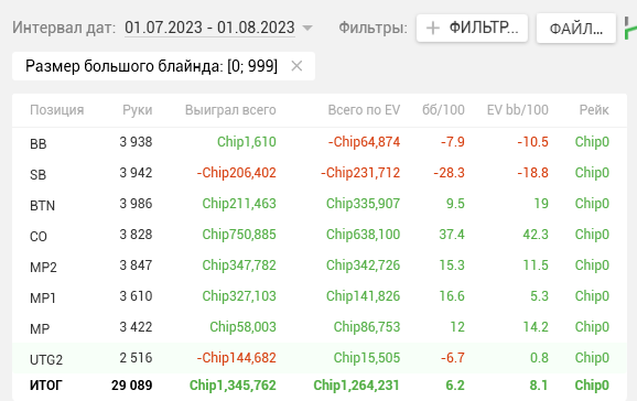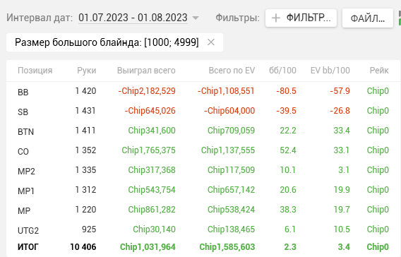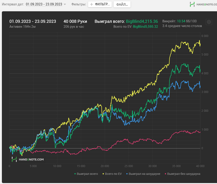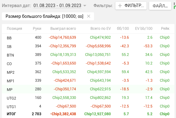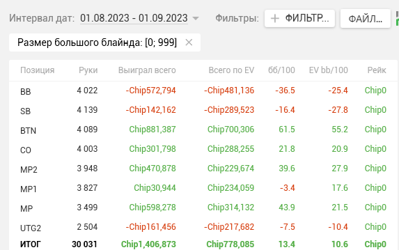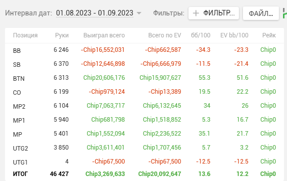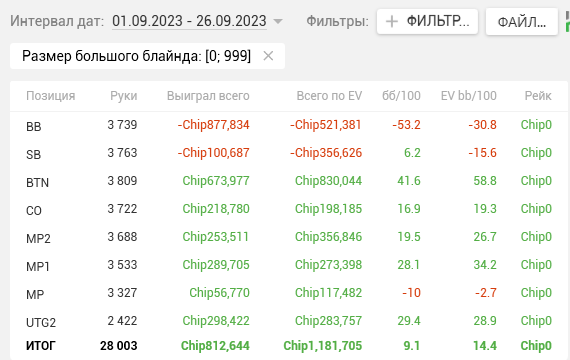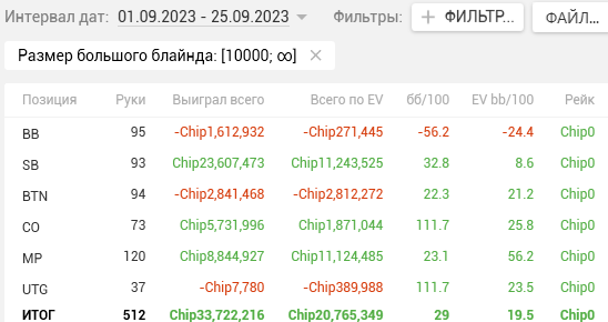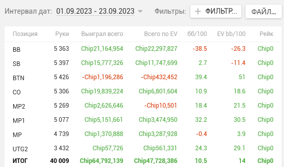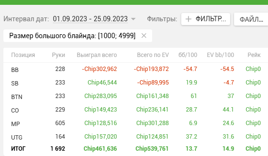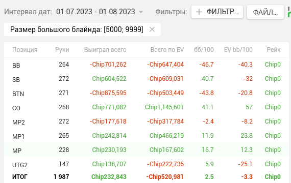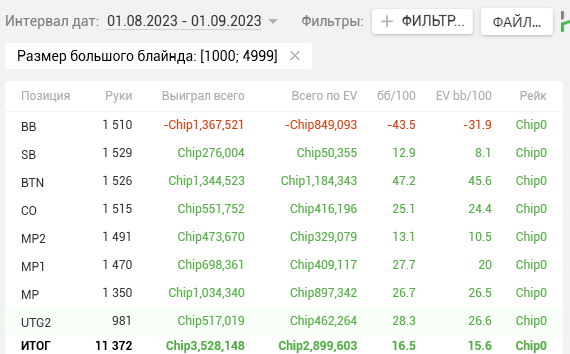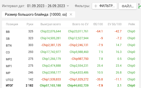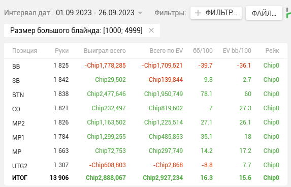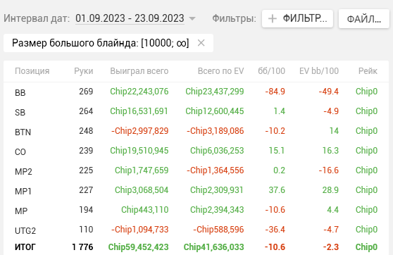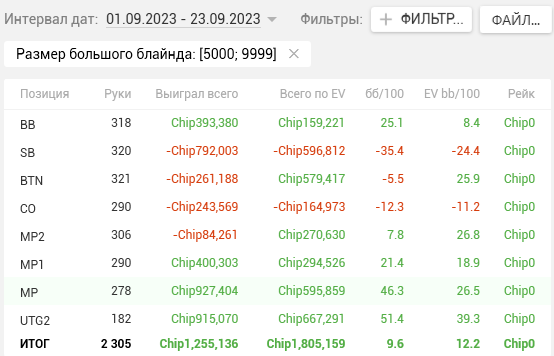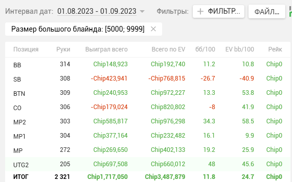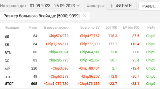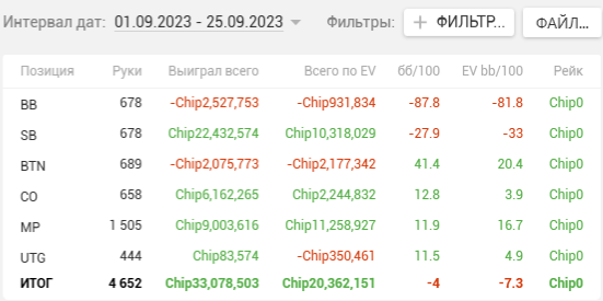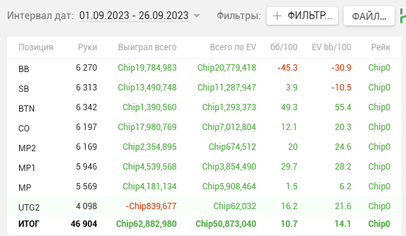 Как видите, почти на каждой стадии двузначные винрейты. + отпечаток наложило 2 тренировки, которые я брал у Правды в июле. Да, в супер дипах ЕВха проседает, но лично я это связываю с плохими структурами на ГГ, который составлял 80% моей загрузки. Когда всё решают выигранные выставления в стеках 15-20бб, тяжело отскочить или не кулернуться. Либо же мне надо прокачивать пуш-фолд, о чём я реально задумался, пока писал этот пост (ведь в сентябре у меня тоже слабая ЕВха в дипах).