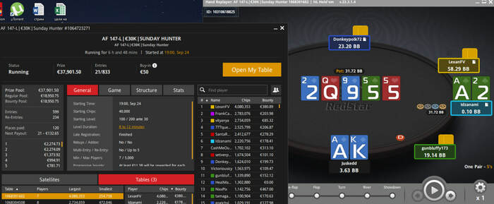 Хочу до конца года отыграть 1500 турниров, чтобы оценить дистанцию на АБИ 25 имея в своём арсенале румы с хорошими турнирами с хорошими структурами, чтобы понять гожусь ли я для игры выше. Игровая сессия с учётом двух выходных в неделю должна составлять 21,7 турниров в день. В принципе столько турниров я и играю, а в воскресенье вообще выходит с запасом.