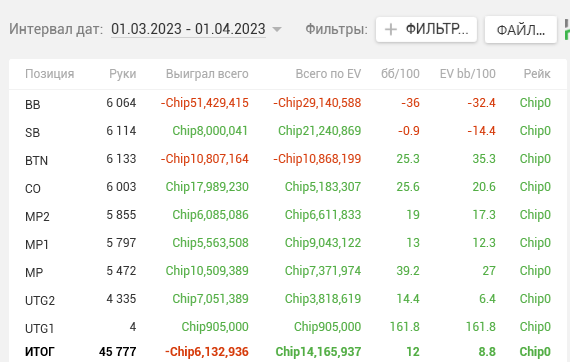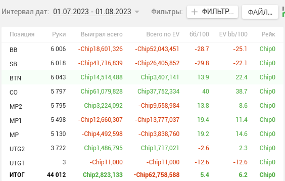 Когда успехов нет, единственное чем можно похвастаться – так это ЕВхой. И то, хвастаться – слишком громкое слово для таких показателей. Игрой своей доволен, сильно не складывается целый месяц, не считая того доезда на 2,5к. Вот, собственно, показатели. Можно заметить, что в УБЕР дипах ЕВха в минусе, но каких-то непонятных действий где я отмораживаюсь или похуй коллю не припомню. Видимо где-то наигрываю не то, особенно на бб, либо кулерят.