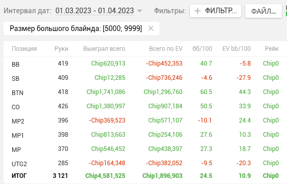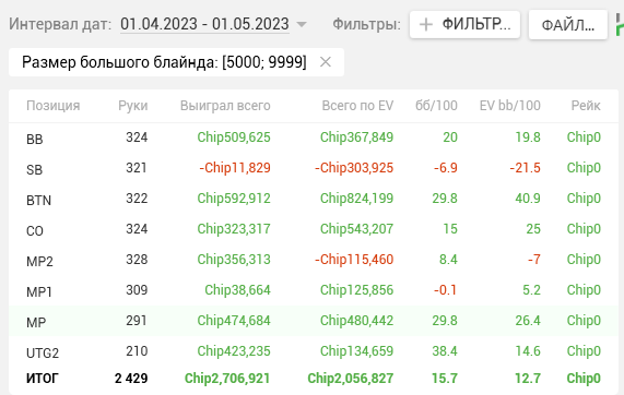 Общий винрейт составил 8,8 evbb/100 при том, что по факту я получил 12 bb/100. Немного апнуло, но в целом всё ровно. Что не так? У меня ДАЖЕ ЕВ НЕ ДВУЗНАЧНАЯ, а я получил 4к зелени! В лютых дипах наиграл ев всего 4,7, а в середине турниров фактический bb/100 в 2 раза превышает ЕВху. Переап? Однозначно! Двигаемся дальше.