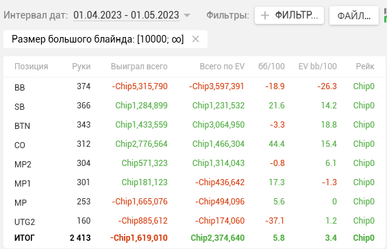 Вчера вечером ко мне в тг постучался грузинский стримлер Багз_Ухо с просьбой показать свои винрейты, поставив фильтр по бай-инам. Мы с Серегой хорошо общаемся и периодически обмениваемся новыми знаниями. Данное сообщение стало катализатором того, что в сегодняшний выходной я 3 часа сидел и ковырялся в х2н, выставляя различные фильтры. То, что я там увидел, меня повергло в лёгкий шок. Как бы не хотелось в это верить, но выяснилось что Я МАКСИМАЛЬНЫЙ ПЕРЕАП. Те винрейты, что я показывал на протяжении последних 5ти месяцев, и близко не достойны выигранных за этот период денег (23500$ на аби 24). А то, как я умудрялся плюсовать, играя 1 ПокерОК в прошлом году, остается загадкой. К сожалению, руки за тот период достать не предоставляется возможным.