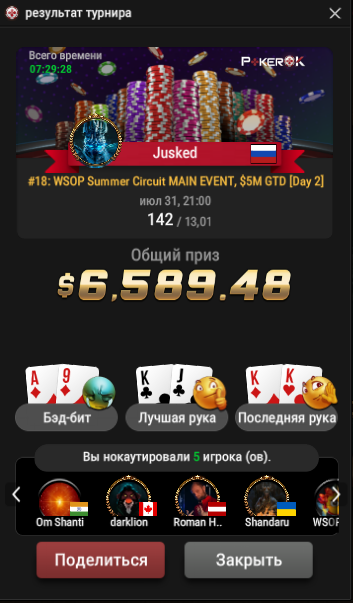 Справедливости ради, хочется сказать что весь месяц шёл около нуля и в последний день заработал 2к в турнире за 25 + задипранил ВСОП Меин Ивент за 525, в который отобрался через сат за 20. То есть бОльшая часть профита сделана в турнире, который в принципе я играть не должен.