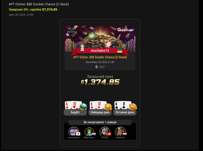 Якщо не помиляюсь, то за фіналкою вибив усіх. Мої скромні 4% (343дол.), так як 96% купили)))