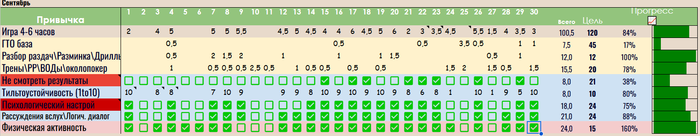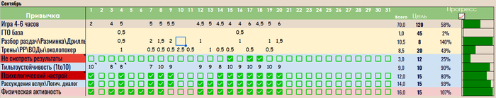 Распечатал себе календарь из курса А-гейм на 30 дней. Поставил целью «не бить по столу». Купил зеленый маркер, буду ставить галочки каждый день, если ударил по столу – рвешь листок и распечатываешь новый, таким образом, чем дольше я держусь – тем меньше желания сорвать прогресс. Поставил его прям перед глазами, чтоб фоновым зрением видеть эти зеленые отметки и мб это поможет иной раз сдержаться и увести себя обратно в логический мысленный ручей. Посмотрим, что из этого выйдет в следующем отчете.