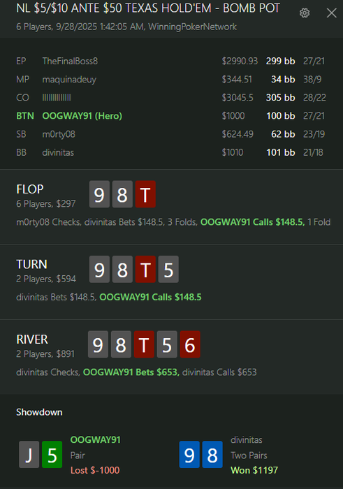 А по истечении буквально 1 минуты, когда пелена эмоций слегка спала, понимаю, что кол то как раз может и не супер очевидный(опп таймбанк потратил), но очень грамотный. Окей, моя рука конечно самое то для пуша как раз с целью выдавливать такие руки и все что слабже, но вместе с ней еще пара сотен комб мисснутых дро и переблефовать здесь крайне легко, а вот мое велью будет как раз срезано сильно за счет динамичности борда, улетев в рейзы флопа\терна.