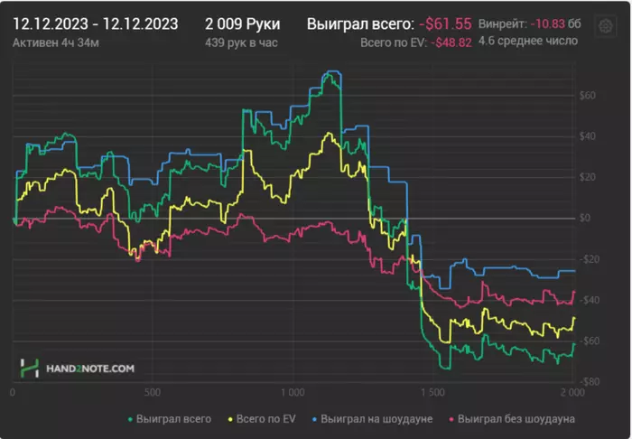 Итог Дня 19 челленжа: две сессии (обе на стриме), 2.160 рук, профит +$2 )))