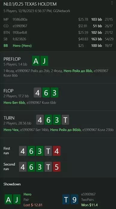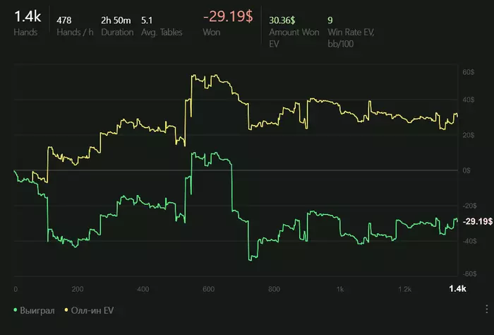 Вчера первая сессия +$30, вторую тоже начал бодро в +$20, а потом просто без шансов -5 стеков за 400 рук, и на этом всё. Посмотрел с утра раздачи, в одной можно было отскочить (там против спектра в монетку выставлялся, но как водится - впаялся в топ этого спектра), остальное всё дефолт. Что интересно - весь минус QQ принесли: