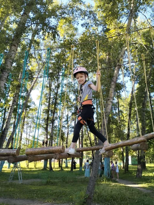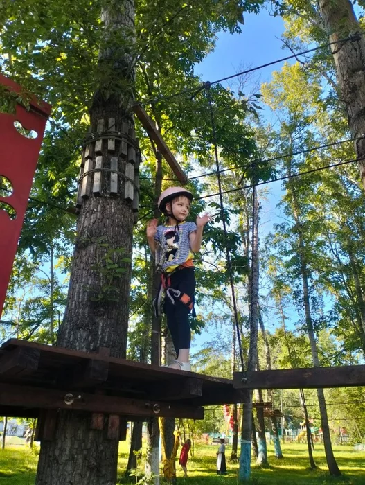 Пошли в парк гулять. Старшая увидела развлекашку - что-то вроде полосы препятствий, висящей на трехметровой высоте