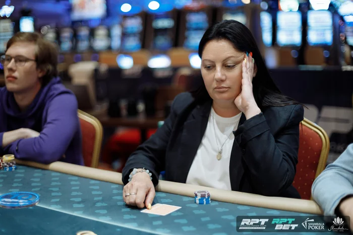 Только-только крутанула стек Инна Василевская, как попала в неприятную ситуацию. Защитилась на ББ против открытия с BU Евгения И с . На терне Василевская запушила 217к и получила колл от . Казалось, что очередное удвоение у нее в руках, но увы… ривер и фулл-хауз для Евгения.