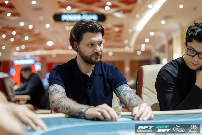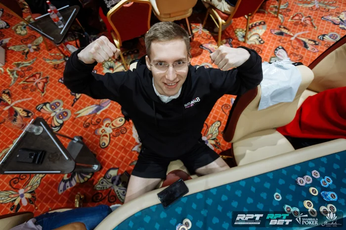 Сергей Шапошников забрал стек ещё у одного оппонента. Выехали префлоп в Филиппа Лебедева. Без боли, короли утояли.