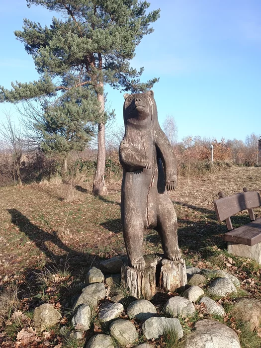 Напротив храма стоял все тот же старенький медведь — деревянная фигура, потемневшая от времени и дождей. Он протянул вперёд свои широкие лапы, будто хотел обратиться к каждому, кто проходил мимо: