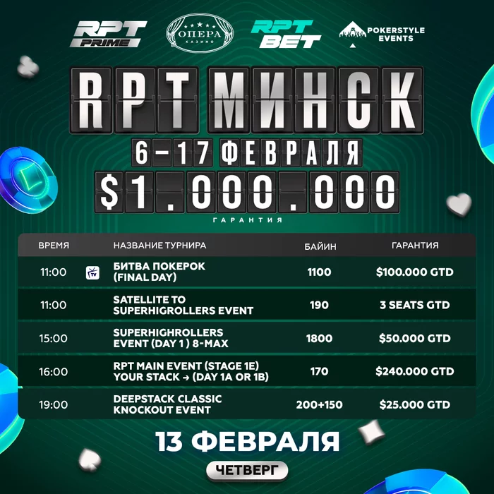 🕓 В 16:00 сыграем $170 RPT Main event (Stage 1E) — your stack — day 1A or 1В. 20% участников пронесут свои стеки в целевой турнир.