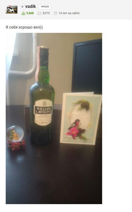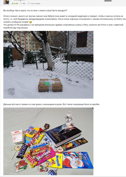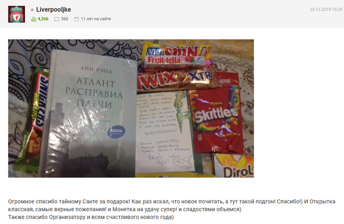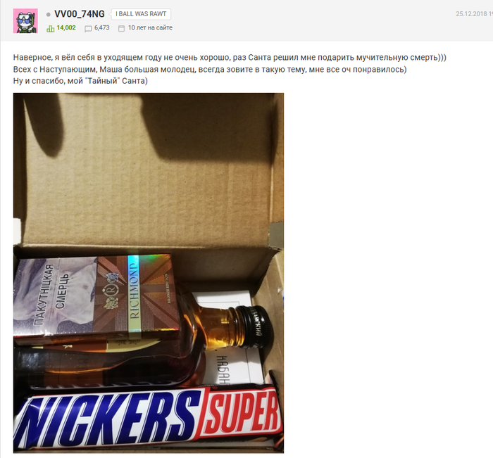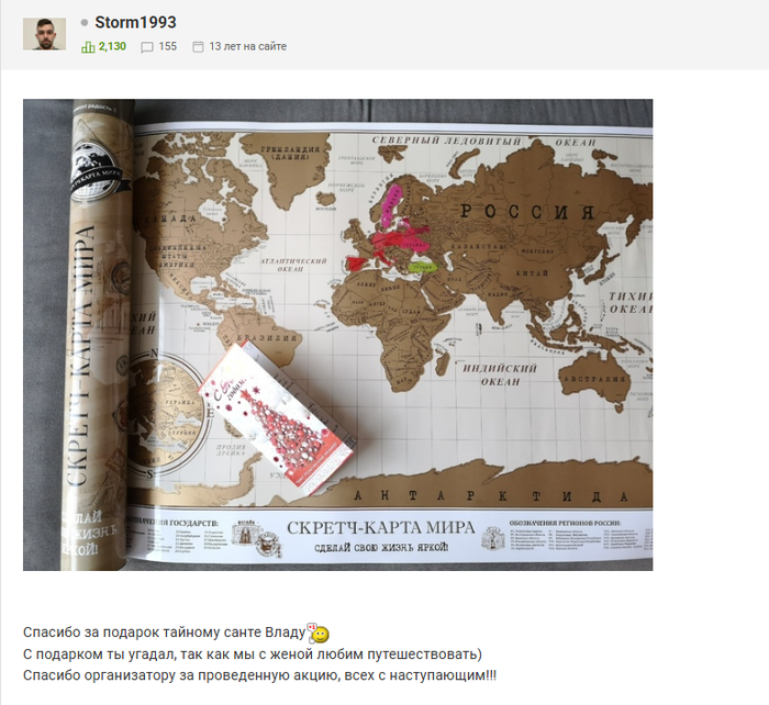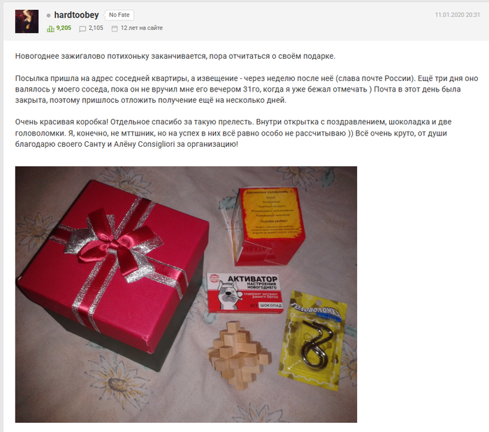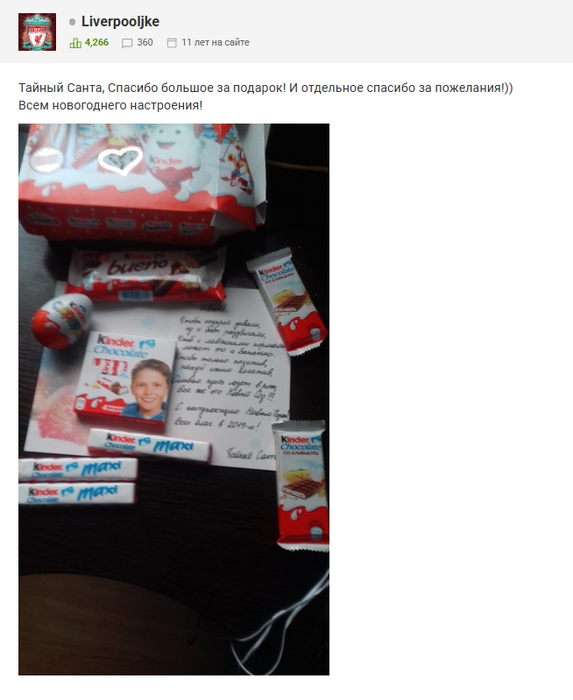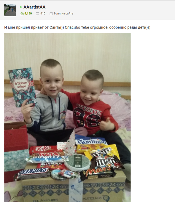 Я получил её 30 числа, побыстрому готовил салаты, че то делал на кухне, а когда пришёл то у одной из настольных игр, сын порвал в клочья упаковку, поэтому фоткать не стал, потом бухал, потом заболел и не хотел что бы мое сообщение превращалось в "спасибо санта". Это очень круто, особенно открытка,чувак даже на ней нарисовал и написал пожелание.