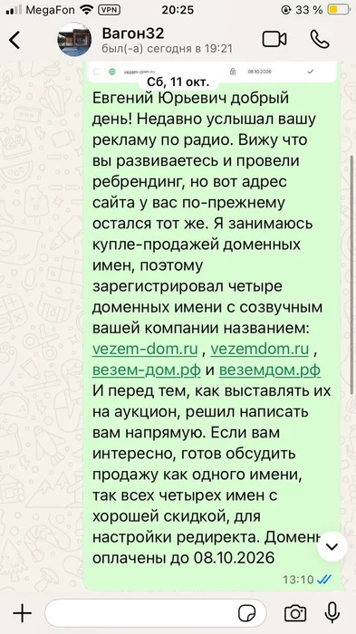 Где-то недели две назад, мы с Машей стали частенько включать дома радио. И там постоянно крутили рекламу модульных домов с доставкой по Брянску и всему ЦФО. Мне стало интересно, что это за компания, так как мой дом, о котором я подробно писал в этом блоге, так же является модульным. Мне его строила компания «Вагон32», а по радио крутили компанию с названием «Везём дом». И когда в один из дней моё любопытство снова дало о себе знать, я вбил в поисковик название «Везём дом», мне выдало сайт компании «Вагон32». В этот момент я понял, что компания «Вагон32» провела ребрендинг, но адрес сайта по-прежнему остался прежним - vagon32.ru Выглядит это нелепо, поэтому недолго думая, я зашёл на сайт регистратора доменных имён и стал проверять адреса сайтов, созвучных с «Везём дом». В итоге, в этот же вечер я регистрирую четыре доменных имени: vezemdom.ru, vezem-dom.ru, веземдом.рф и везем-дом.рф. И уже на следующий день пишу напрямую директору компании, с которым мы знакомы лично, вот такое сообщение: