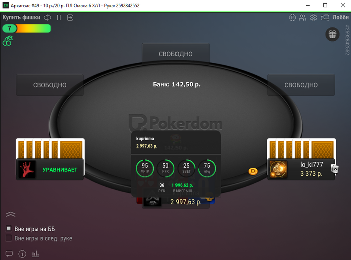 В моменты, когда интернет бывает доступен, я пробовал смотреть расписание на Феноме, где в основном те самые «другие» игры, на которых я специализируюсь. Там есть интересный для меня турнир по лоуболлу за 5$, но я даже ни разу не смог попробовать его сыграть, по причине постоянного отсутствия интернета. Удалось только на 10 минут зайти в кэш на ПокерДом за стол по ПЛ 6-карт Омахе Х-Л, сделать +3 бай-ина с VPIP'ом 95%, после чего интернет снова отвалился (ниже скрин только с первых 36 раздач). И уже после этого я окончательно оставил попытки поиграть в покер в России.