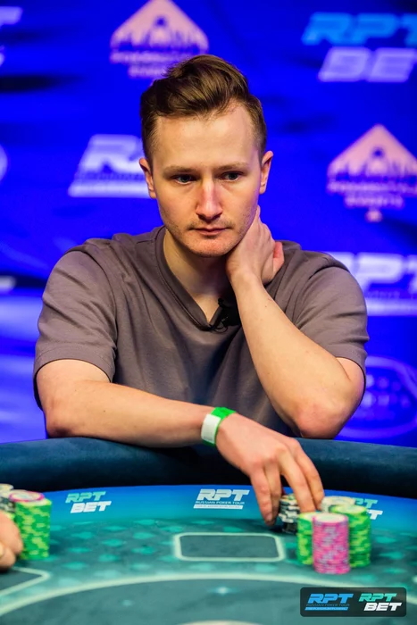 На терне Андрей уже отсчитал нужное количество фишек, чтобы отдать их Рудневу, но доехал в семерку на ривере: .