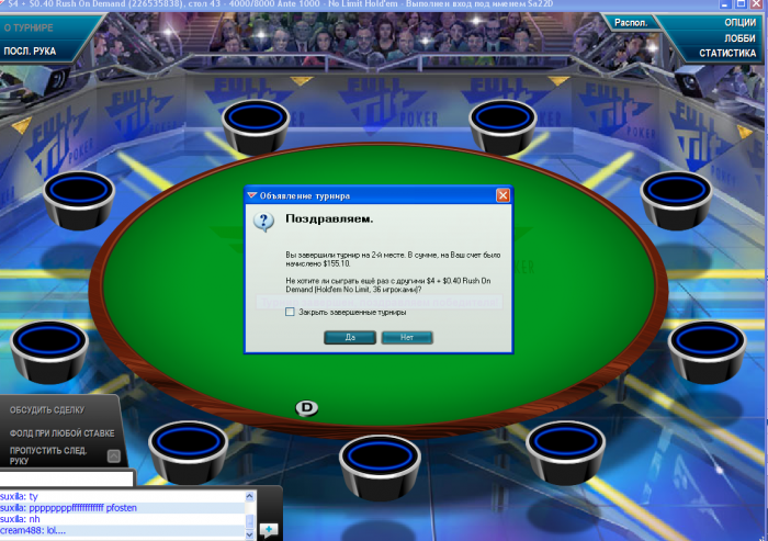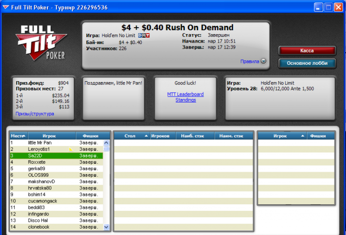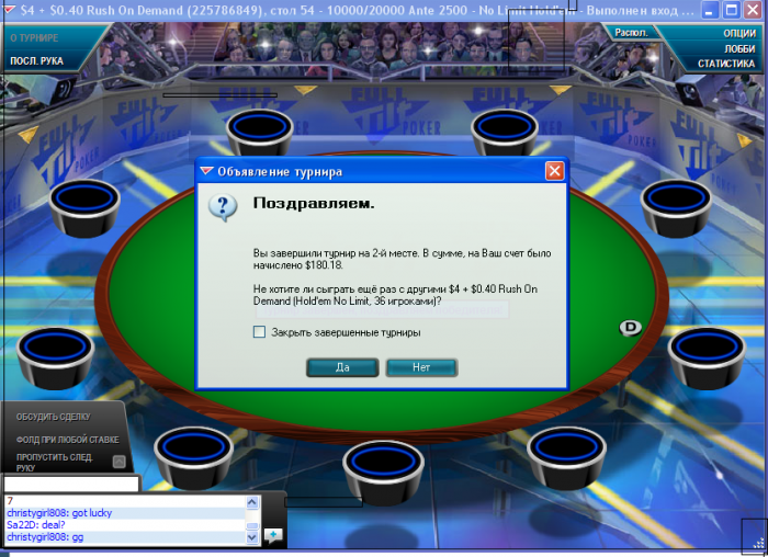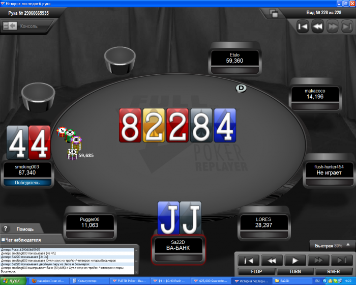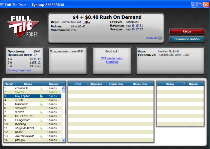 Сегодня в раши за 4.4 занял 4 место. Никак не дается 1 место в этом турнире. Уже второй раз я занимаю 4 место. Решающая раздача где я вылетел AQ<KQ
