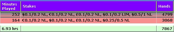 Каточка полный шлак. Играть в айпокере все труднее и труднее. Нынешний нл20 нынче стал сильнее нл100 старсов полугодичной давности. Особенно это чувствуется после нового года. Новогодние желания фишей научиться играть исполнены и зарабатывать на нл20 играя 16 столов становится все менее реально. Ну это все ерунда, конечно, просто у меня даунстрик ну отчетик за день...или полтора... вообщем, режима сейчас нет, поэтому какой игровой день идет я не знаю. Буду считать по календарным и вот нашел еще забавный скрин одной из сессий на прошлой неделе. Тут больше 1к рук. У кого-нибудь такое бывало вообще?)
